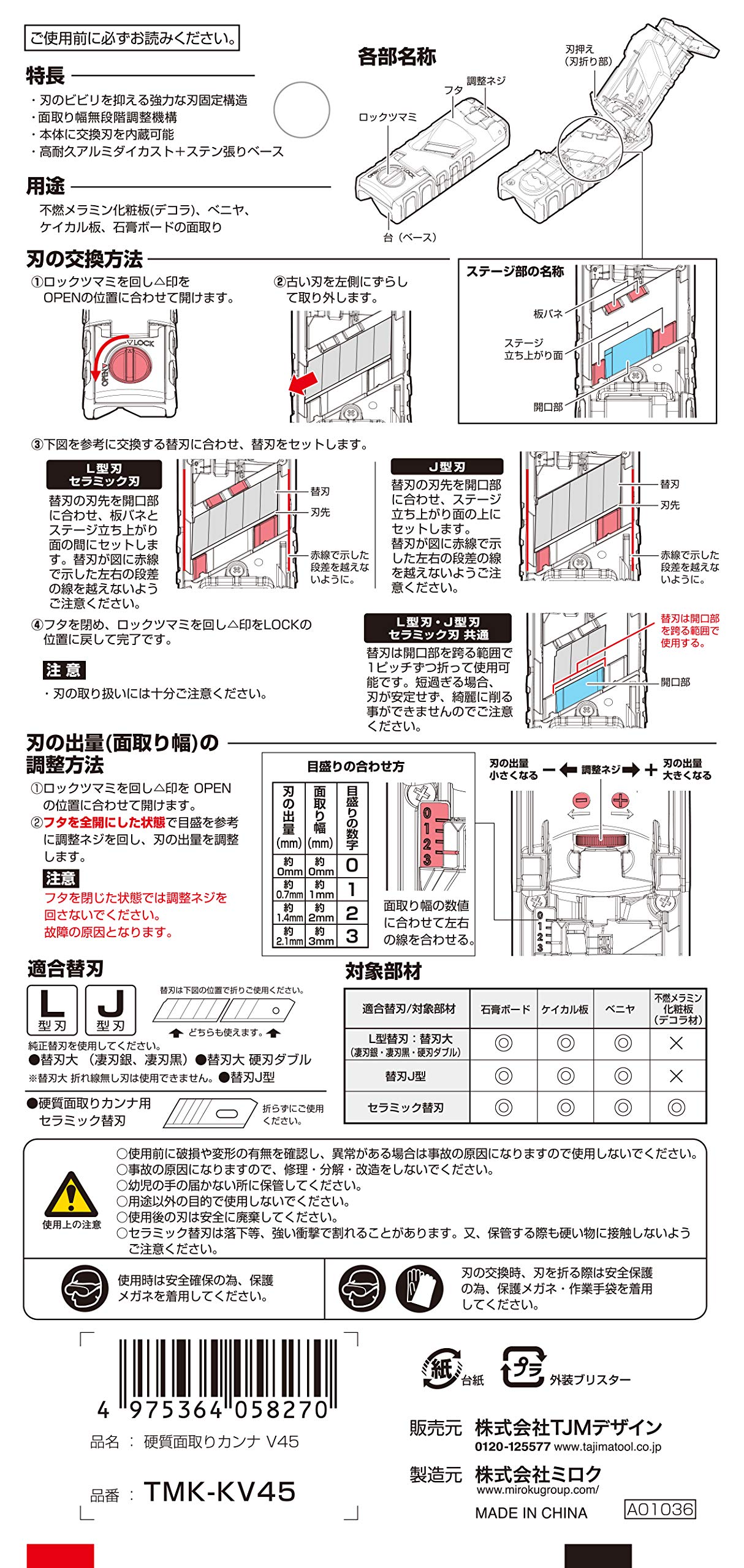 TAJIMA Drywall Chamfer - 130mm Adjustable Width 45 Degree Chamfer Tool with Ceramic Blade & Die-Cast Aluminum Base - TMK-KV45